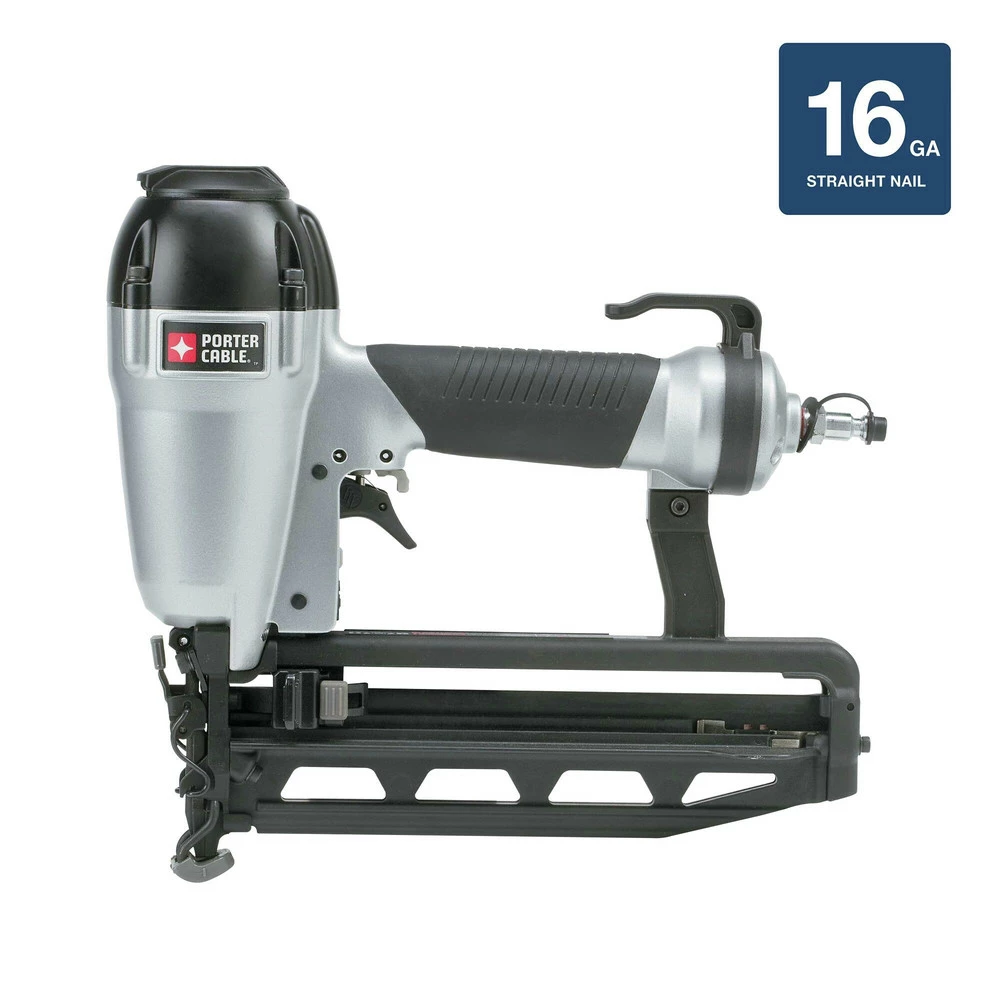 Porter-Cable FN250C. Features: Uses 16-Gauge finish nails from 1 in. to 2 1/2 in.. Internal piston catch for consistent max power on every shot. Power to drive into hardwoods. Long life maintenance free motor. Tool-free nail depth control with detents. Tool-free jam release mechanism designed not to block line of sight. Tool-free adjustable exhaust. Trigger lock off switch. Non-marring nose tip with on tool storage.