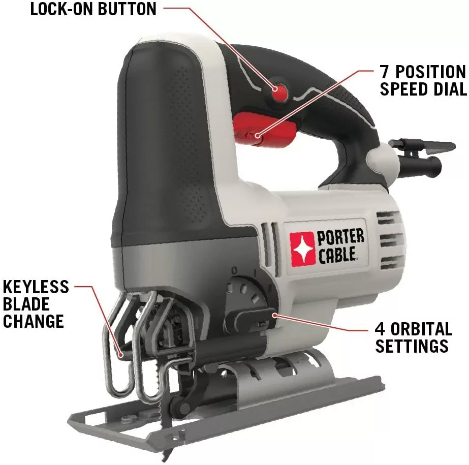 The PORTER-CABLE PCE345 6 amp Orbital Jig Saw is designed with a 7 position speed dial (0-3200 rpm) integrated into the trigger which provides multiple speed settings for optimal cutting results. The 6 Amp motor delivers more power in demanding applications, and the 4 orbital settings provide best cutting performance in a variety of materials. It offers a lock-on button that provides easier control during prolonged use, and help to diminish user fatique, along with an oversized front and handle overmold that provide greater control and comfort during use. This jig saw also offers tool-free blade change to make blade replacements fast and easy and minimize down time.