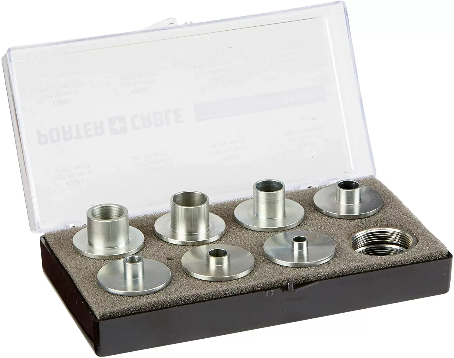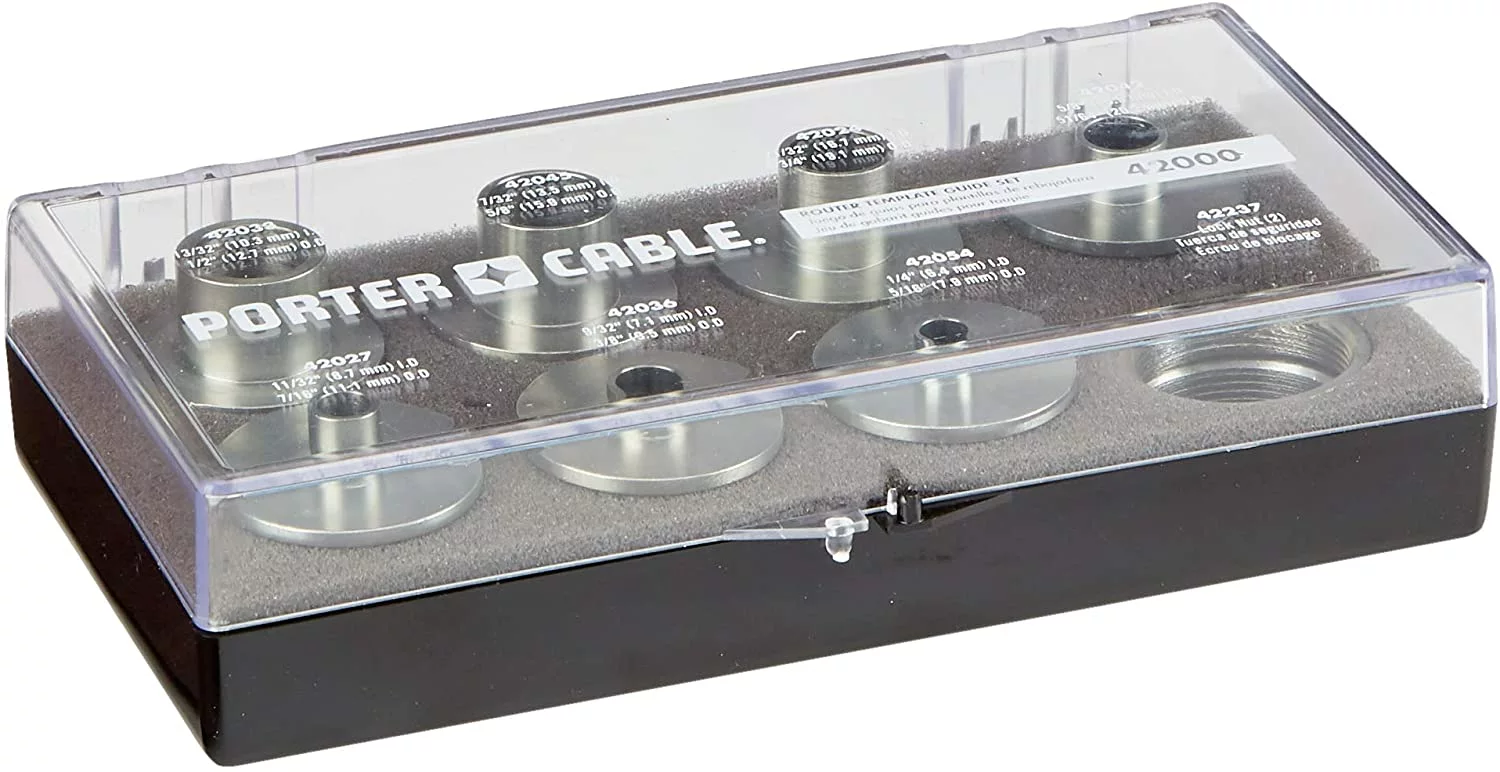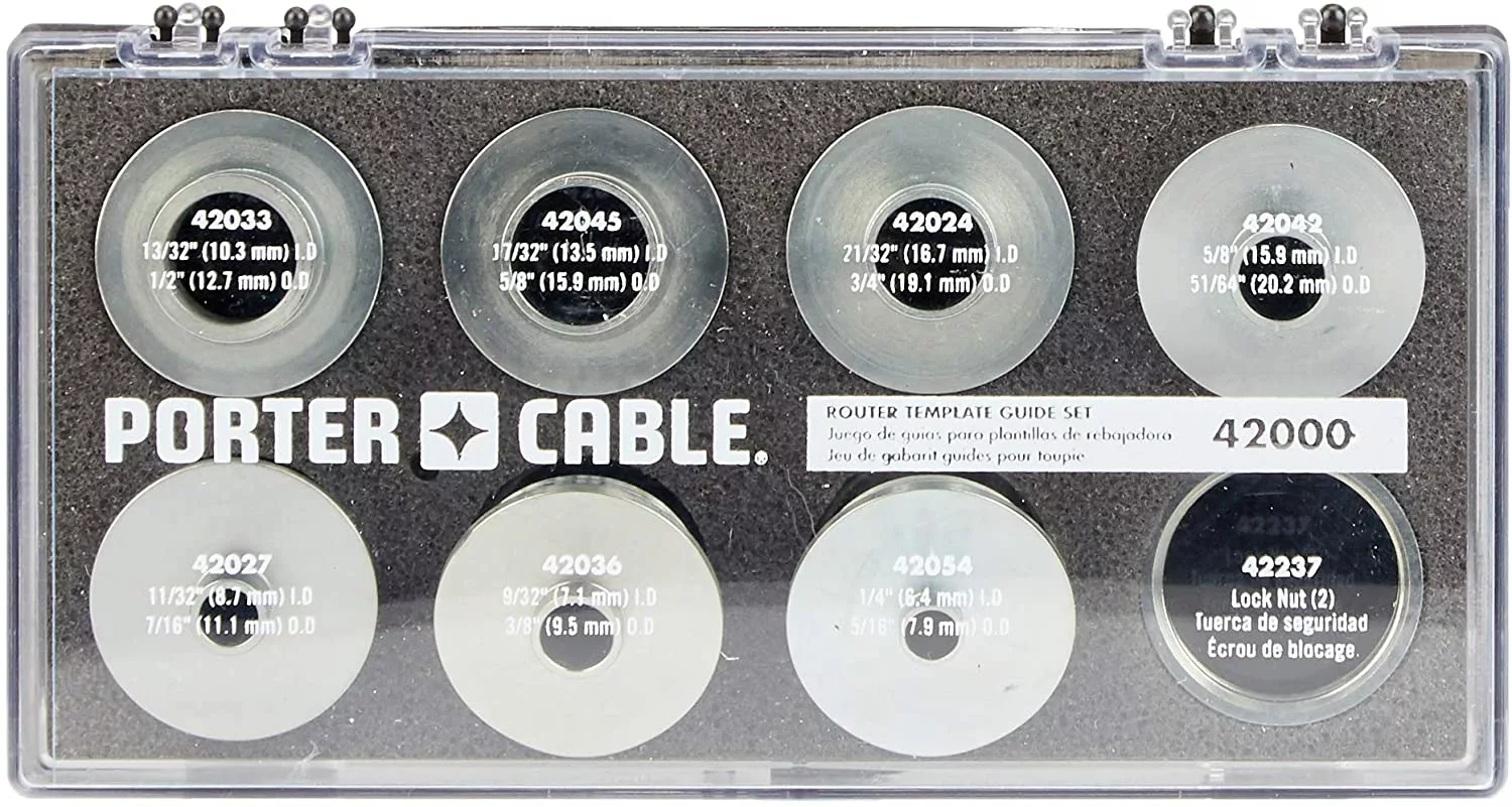 No ifs, ands, or buts about it—if you need a versatile set of templates, then Porter-Cable 42000 9-Piece Template Guide Kit is the perfect kit for you. It’s easy to operate and a great way to save time. The kit is comprised of template guides 42027 and 42057 for dovetails; 42042 for hinge butt jigs; and general guides 42024, 42033, 42036 and 42045. In addition, two 42237 lock nuts are included. Versatile and durable, this innovative kit is crafted from precision machined steel and is compatible with Porter-Cable, DEWALT, and Makita routers plus any others built with a template guide adapter.